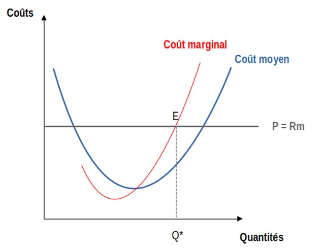 En concurrence pure et parfaite, le producteur est supposé preneur de prix. L’enjeu pour lui, est de maximiser son profit. Il réalise un profit pour chaque unité produite pour laquelle sa recette marginale est supérieure à son coût marginal. La recette marginale (Rm) est celle réalisée pour une unité produite supplémentaire. Comme le prix est supposé constant, elle est égale au prix pour chaque unité produite. Tant que le prix est supérieur au coût marginal, le producteur a intérêt à produire, il s’arrête de le faire dès que le prix devient inférieur à la recette marginale. L’équilibre du producteur en concurrence pure et parfaite est donc atteint pour la quantité produite telle que Prix = Coût marginal.