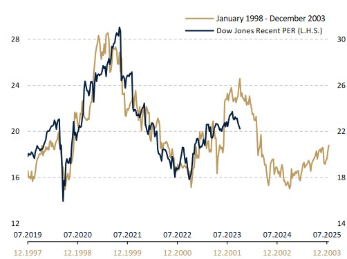« Entre le 01 octobre 2022 et le 30 juillet 2023, les principaux indices boursiers ont connu 10 mois de bull market, gagnant 28% en moyenne. La situation semble s’être inversée depuis le 01 août 2023, le MSCI World All Countries, le S&P 500 et l’Euro Stoxx cédant tous les trois quelque -9%. Nous avons régulièrement détaillé le caractère atypique de ce marché haussier, nullement bâti sur des fondamentaux micro et macroéconomiques (figure 1), mais entièrement sur le regain de confiance prématuré des investisseurs et sur l’envolée temporaire des multiples de valorisation, comme lors du dégonflement de la bulle internet entre 2000 et 2002 (figure 2) ».