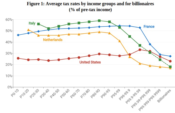 Dans un rapport pour le G20 publié en juin 2024, il a cherché à établir des données statistiques sur l’imposition des individus selon leur niveau de revenu. Ses données montrent, pour la France comme pour d’autres pays, une « régressivité » de la fiscalité à partir des plus hauts revenus. On dit que l’impôt est « régressif » quand le taux effectif d’imposition (ce que paient les agents économiques en impôt en fonction de leur revenu) devient plus faible quand le niveau de revenu augmente.