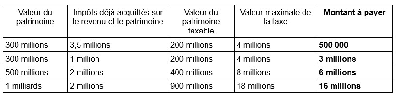 Simulations de calcul de la taxe Zucman en fonction de la valeur du patrimoine et du montant des impôts déjà payés par l’individu (valeurs fictives)