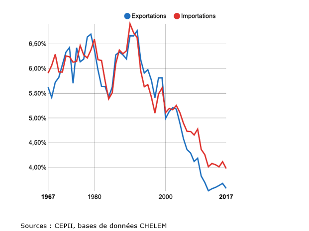 Selon le Cepii, les importations françaises représentaient 4% des importations mondiales en 2017.