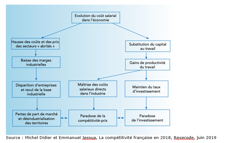 Les hausses du coût salarial (salaires et/ou cotisations sociales) réduit la compétitivité-prix de entreprises. D’une manière générale, la hausse des coûts de production (coûts de main-d’œuvre, hausse du coût des intrants, etc.) augmente les prix de vente.