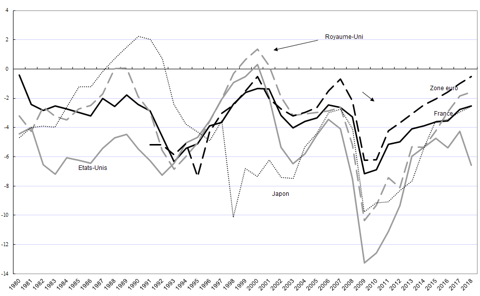 - Le solde public de la France est passé de – 6,4 % du PIB en 1993 à – 1,3 % en 2000 d’après l’OCDE tandis que celui de la zone euro passait de – 5,9 % en 1993 à – 0,5 % sur la même période.