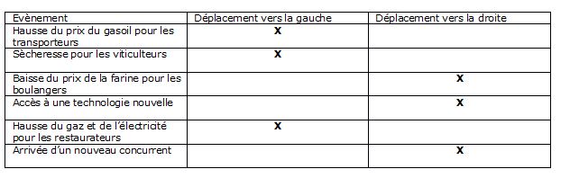 - Indiquer dans le tableau si les facteurs présentés amènent un déplacement de la courbe d’offre vers la gauche ou vers la droite