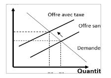 L’introduction d’une taxe modifie peut aussi avoir un impact sur l’offre. Ce peut être, par exemple, le cas d’une taxe sur le gasoil supportée par les entreprises. Ce type de taxe entrainera une hausse des coûts de production, donc une réduction de l’offre. Graphiquement, la courbe de d’offre se déplace donc vers la gauche.
