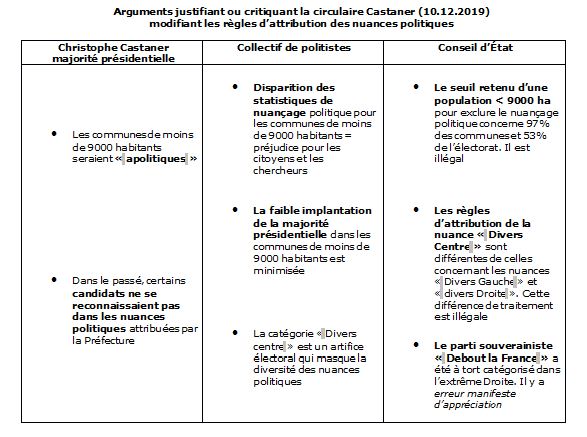 Le nuançage politique est une opération de classement des résultats électoraux réalisée par le Ministère de l’Intérieur permettant d’éclairer les citoyens sur la structure de l’offre politique. En pratique, les préfets attribuent une « nuance politique » aux listes et candidats en lice lors d’un scrutin en opérant des regroupements par proximité idéologique Cf. Supra, Question 1 : Comment interpréter la participation électorale à partir d’indicateurs?, dossier sensibilisation, doc.5). Ces informations sont utilisées par les électeurs pour décrypter les enjeux d’un scrutin et par les chercheurs en sciences politiques. Cela explique que la « circulaire Castaner » du 10 décembre 2019 modifiant les règles d’attribution de ces nuances avant les élections municipales de mars 2020 ait été durement critiquée par de nombreux politistes et sanctionnée par le Conseil d’État (doc.4). Cette circulaire a été remplacée par celle du 3 février 2020, le Ministre de l’Intérieur prenant acte de l’enjeu : le principe de transparence en démocratie représentative ne peut être mis à mal.