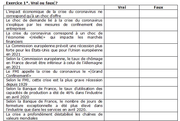 1) Puiser dans le texte des éléments liés à la crise du coronavirus qui correspondent à des chocs d’offre et à des chocs de demande
