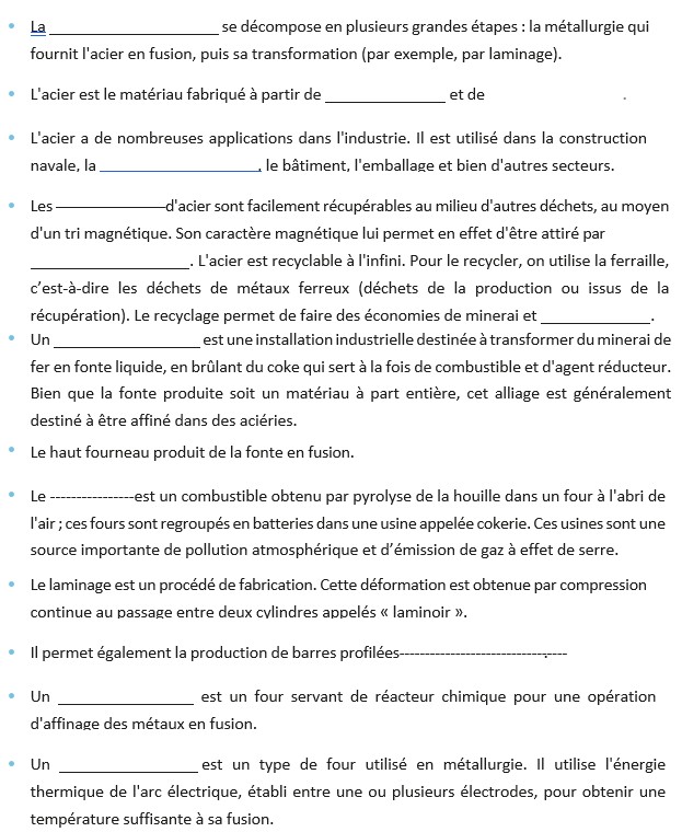Q2. Compléter le texte lacunaire (texte « à trous ») pour comprendre les étapes de la production d’acier.