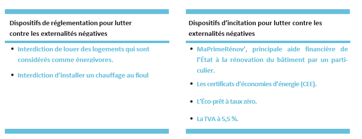 Dans le cadre de l’enseignement de spécialité en classe de première, les élèves auront abordé les défaillances de marché et les externalités – notamment la pollution – dans le chapitre « Quelles sont les principales défaillances de marché ? ». Ces notions seront utiles dans cette MEA pour comprendre les enjeux autour du secteur du bâtiment, soit une activité émettrice de gaz à effet de serre pendant la construction mais aussi dans le bâti existant, en raison de la mauvaise isolation des logements. La hausse des besoins de main-d’œuvre s’inscrit dans le cadre de cette transition énergétique, illustrant elle-même le rôle des pouvoirs publics face aux externalités.