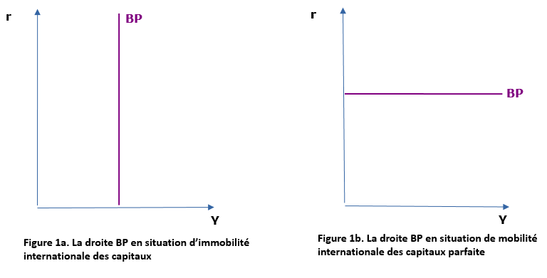 Cependant, la pente de BP dépend du degré de mobilité des capitaux à l’international pour le pays. On distingue ainsi deux cas typiques : quand le pays ne connaît pas de mouvements de capitaux vis-à-vis de l’étranger, la droite BP est verticale alors que quand le pays connaît une mobilité parfaite des capitaux à l’international, la droite BP est horizontale (figure 1a). Dans ce cas, l’équilibre BP se fait pour un niveau de taux d’intérêt donné. Un déséquilibre avec l’extérieur (par exemple, les exportations deviennent supérieures aux importations) conduit à des mouvements de capitaux (l’argent obtenu est placé à l’étranger), ce qui fait que le taux d’intérêt est inchangé. Le niveau de revenu, lui, peut être modifié car il n’y a pas de « compensation » par la création ou la destruction de monnaie (figure 1b).