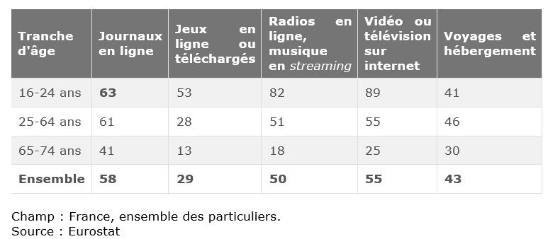 Une génération est l’ensemble des individus nés pendant une période donnée. Selon Eurostat, 89% des 16-24 ans écoutent des radios en ligne et de la musique en streaming en 2018 contre 18% pour les 65-74 ans.