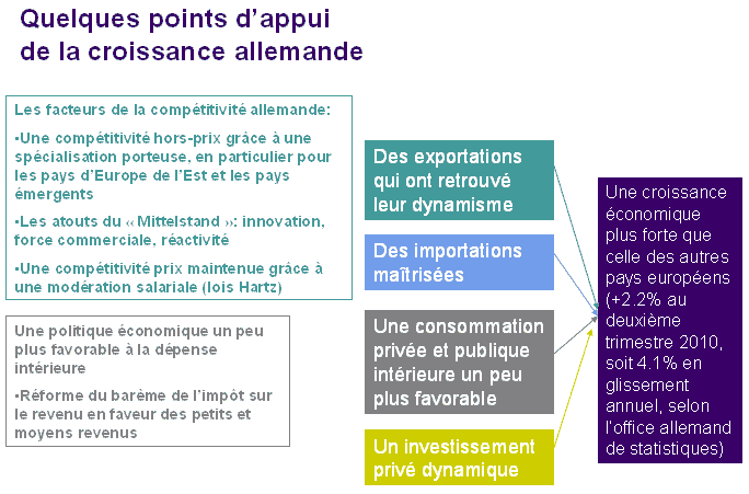 Les produits allemands ont bénéficié de la croissance des pays émergents et de l’augmentation de leur demande de biens d’équipement et en produits « high-tech ». L’industrie allemande bénéficie d’avantages comparatifs dans l’automobile, la construction mécanique et la chimie, les équipements de transport, automates et machines-outils représentant environ la moitié de son excédent commercial. L’Europe centrale constitue également un marché particulièrement accueillant pour l’Allemagne, en raison de sa proximité géographique et culturelle. Elle fournit de nouveaux débouchés et des bases-arrières de production bon marché.